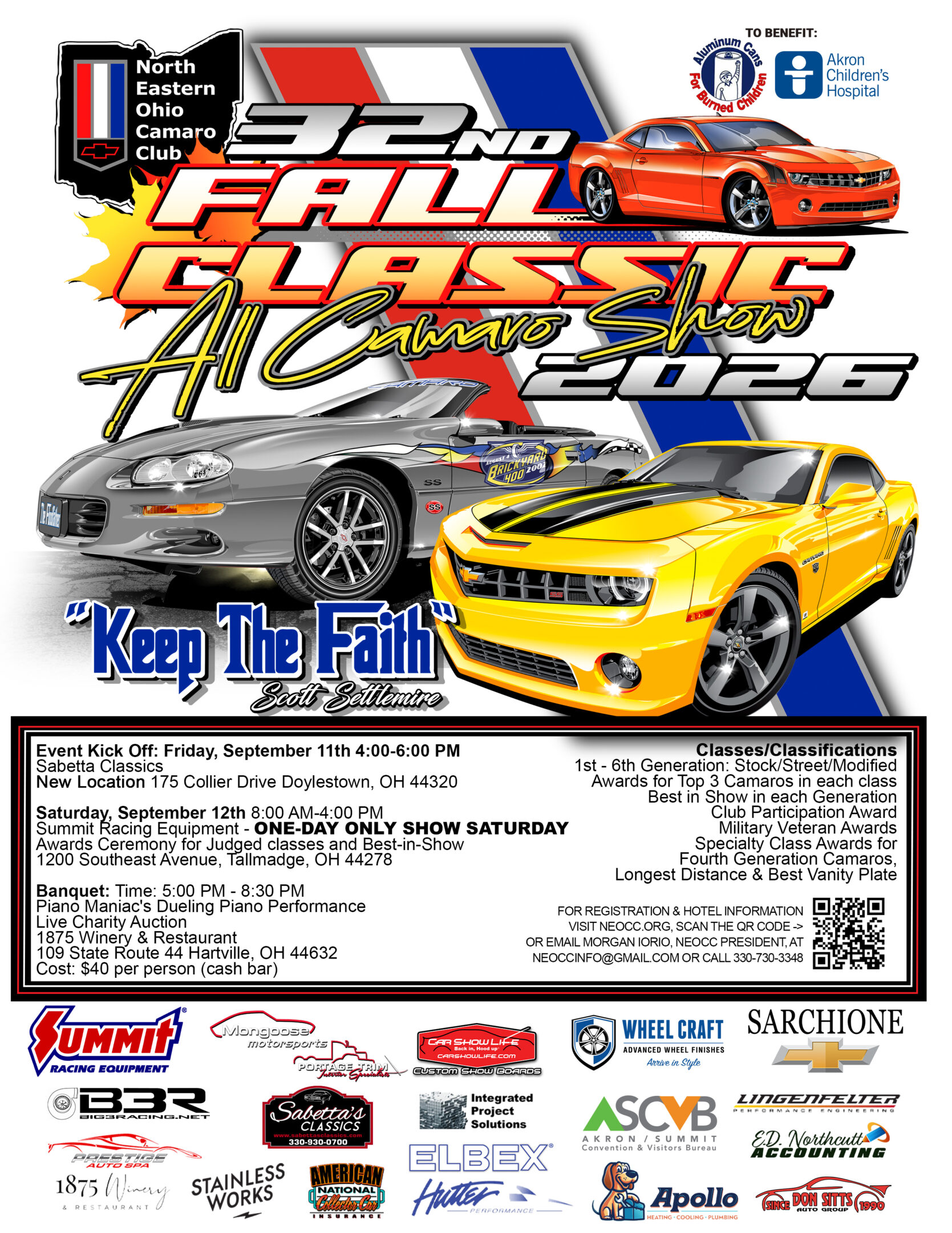 The NorthEastern Ohio Camaro Club (NEOCC) Fall Classic is an annual celebration of Camaro heritage, bringing together enthusiasts from across the country for a weekend of car shows, awards, food vendors, off-site dinner and camaraderie. More than just a car show, the event is dedicated to giving back, with proceeds supporting local charities.
